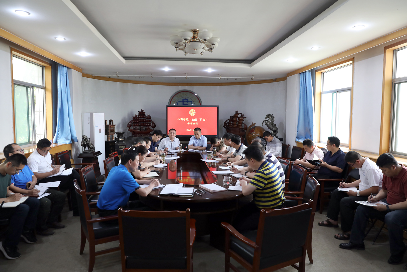 6月1日上午,德赢vwin体育官网党委中心组(扩大)在东会议室传达学习学校相关会议精神,全体院领导、院工会主席、各支部书记、各系部科室正副主任及团委负责人参加会议。学习会上,院党委书记许国宝传达学习了学校联防联控第十一次工作通气会及学校2020年第二季度党务工作会议精神。他强调,大家要把党的政治建设放在首位,严肃党内政治生活,持续深入开展“三会一课”制,抓好各支部品牌活动等;要坚持立德树人,结合体育特色,充分挖掘课程思政元素。并要求大家注重学用结合,通过理论学习,提高工作自觉性与主动性;要高度重视意识形态管控,狠抓学院安全工作,各部门迅速开展安全排查,建立安全工作台账;要重点关注学生思想动态和心理状况,针对性的做好教育引导和心理疏导工作。(院办公室/文 邓碾管/摄)