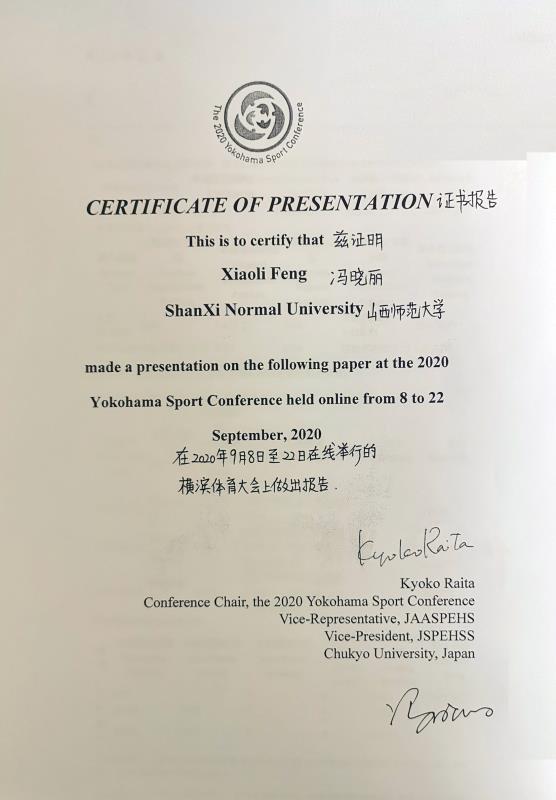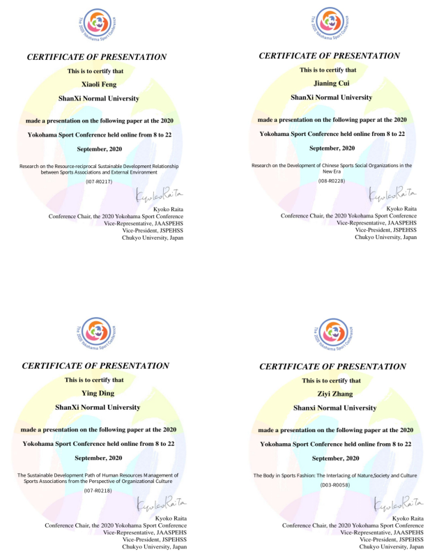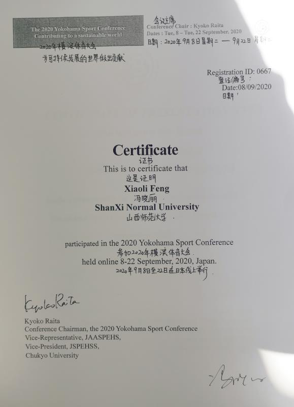 奥林匹克运动会科学大会(简称“奥科会”)由国际体育科学与教育理事会、国际运动医学联合会、国际奥委会和国际残奥会等家组织联合举办,为每届奥运会前在举办国正式举办的世界性体育科学研讨大会,是国际体育科学顶尖论坛。2020 Yokohama Sport Conference—2020横滨体育大会(即2020国际体育科学、教育和医学大会,奥科会)于北京时间9月8日开幕,作为伴随奥运会举行的世界最大规模体育科学大会,奥科会是体育学科类最高级别的综合性学术交流大会,本届奥科会的主题是“Contributing to a Sustainable World”。这次奥科会吸引了来自世界各地的1500多位参会者出席,我校德赢vwin体育官网的冯晓丽教授以及她的硕士研究生崔佳柠、丁颖和张子怡的四篇论文,以口头报告的形式被大会录用。
