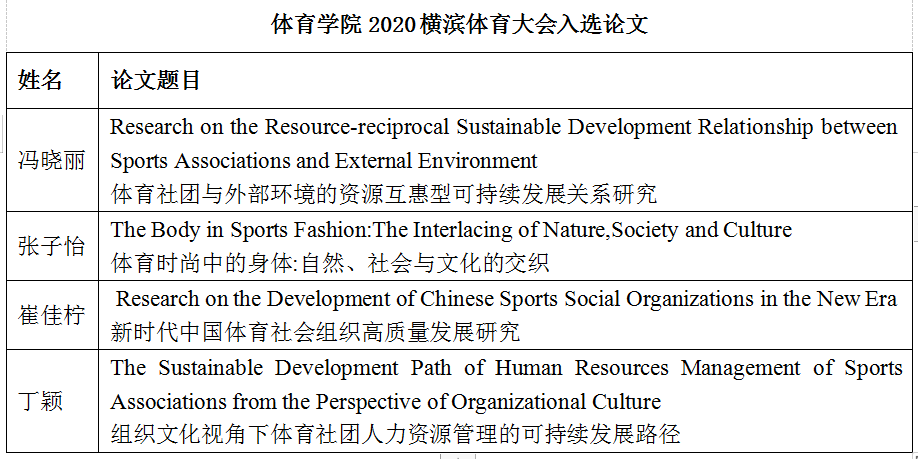 德赢此次入选的论文研究涉及社会体育组织、体育社团、体育管理和体育身体文化等多个领域,冯晓丽教授表示选题来源于对相关领域的长期关注,能在国际性体育学科类综合性最高学术交流大会上与来自世界范围的学者分享、交流经验,获取前沿学术动态,帮助研究生拓宽学习视野,是一件非常有意义的事情。德赢师生论文入选2020横滨体育大会,有利于提升我校体育学科的整体影响力与知名度,进一步激发广大师生潜心开展体育科学研究的热情和动力。