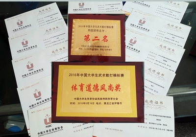 经过6天的激烈角逐,我校选手不畏强手,敢打敢拼,顽强拼搏,在教练员权黎明副教授的带领下取得了优异的成绩。最终获得丙组(民族传统体育专业组)团体总分第二名,丁组(现役散打专业运动员组)团体第五名以及荣获“体育道德风尚奖运动队”的骄人战绩。其中:民体系12级的李龙同学荣获“男子丙组90kg级”的冠军、民体系的13级武江玲同学荣获“女子丙组56kg级”的冠军、民体系的13级谢婵同学荣获“女子丙组65kg级”的冠军、民体系的15级汪莎莎同学荣获“女子丙组48kg级”的亚军、民体系的13级董莎同学荣获“女子丙组52kg级”的亚军、民体系的13级杜森同学荣获“男子丙组85kg级”的亚军、民体系的15级钟震威同学荣获“男子丁组60kg级”的亚军、民体系的13级张孟飞同学荣获“男子丁组70kg级”的季军、民体系的13级孙晨蕊同学荣获“女子丙组60kg级”的季军、民体系的13级刘佳林同学荣获“男子丙组75kg级”的季军、民体系的12级胡光标同学荣获“男子丙组65kg级”的第五名、民体系的15级柳旭东同学荣获“男子丙组56kg级”的第五名、民体系的柳旭东同学荣获“体育道德风尚运动员”称号。