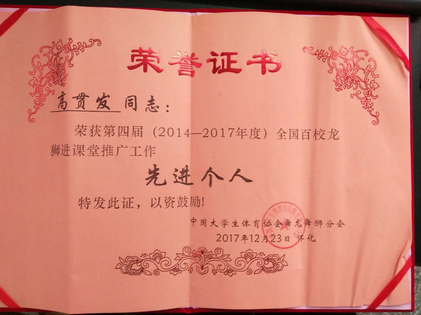 大会对第四批(2014—2017年度)全国“百校龙狮进课堂”推广工作先进单位和先进个人进行了表彰,其中德赢教师高贯发老师荣获“全国百校龙狮进课堂推广工作先进个人”称号。荣誉的获得,是对我校龙狮队参加2015年度、2016年度、2017年度中国大学生龙狮锦标赛取得优异成绩的认可与鼓励。