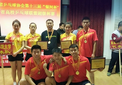4月22日至24日,由山西省乒乓球协会、山西省高校乒乓球联盟主办的山西省第十三届“银河杯”暨山西省高校乒乓球联盟“超霸杯”赛在太原举行。德赢vwin体育官网贾建学副教授担任乒乓球队主教练,派出张开基、王泽刚、卢思锟、李中奇、赵丹、韩子洋、王忻宇七名队员参加了本次大赛。比赛共有22支队伍参赛,采用五场三胜的奥运赛制,分小组循环淘汰,德赢男、女乒乓球队均以小组第一的成绩打进决赛。决赛中,队员们发扬团结协作、顽强拼搏、敢打敢拼、勇夺第一的硬朗作风,充分展示了精湛的球技和团队凝聚力,赢得了观众阵阵掌声与喝彩,表现了师大人良好体育精神风貌,获得了男、女团体冠军,为我校赢得了荣誉。(韩子洋/供稿)