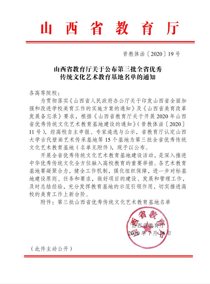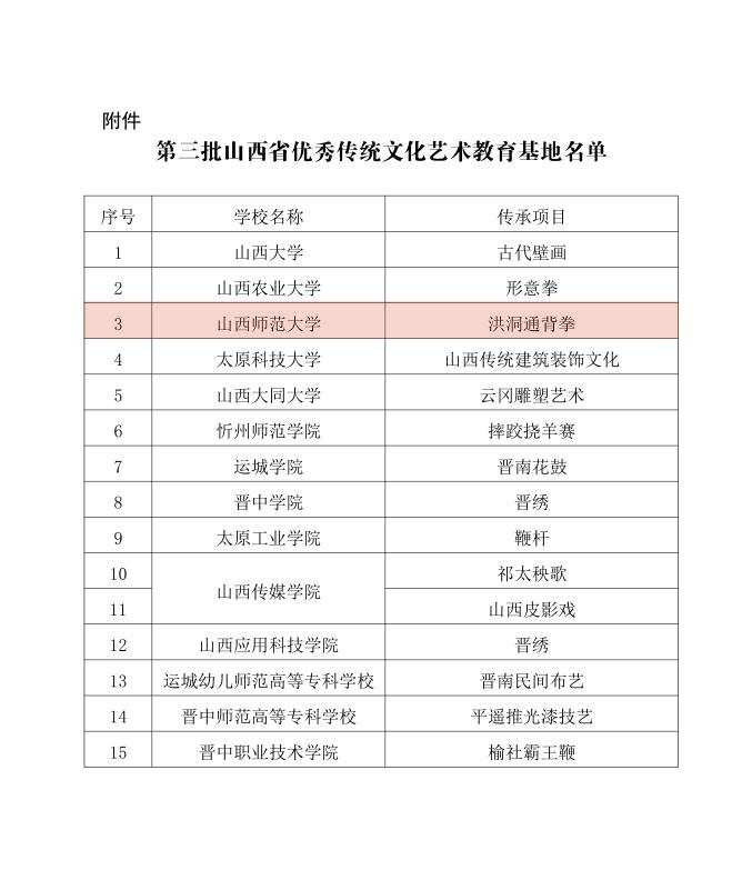 近日,省教育厅下发了《山西省教育厅关于公布第三批全省优秀传统文化艺术教育基地名单的通知》(晋教体函〔2020〕19号),全省共有15所高校的16个基地入选。德赢申报的“洪洞通背拳”成功获批。
