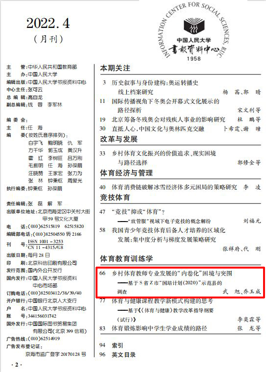 近日,武旭、乔玉成(通讯作者)发表在《体育学研究》2021年第6期的论文《乡村体育教师专业化发展的“内卷化”困境与突围——基于S省Z市“国培计划(2020)”示范县的调查》被中国人民大学书报资料中心《体育》(月刊)2022年第4期全文复印转载。该文主要探究了乡村体育专业化发展发展的成因和对策,认为城乡环境差异、身份认同危机、职业吸引力低下和内生动力不足是其主要原因,并从加强乡村学校硬件和软件环境建设、强化身份认同、唤醒发展意识和激发内生动力等方面破解乡村体育教师专业发展陷入“内卷化”困境的策略。