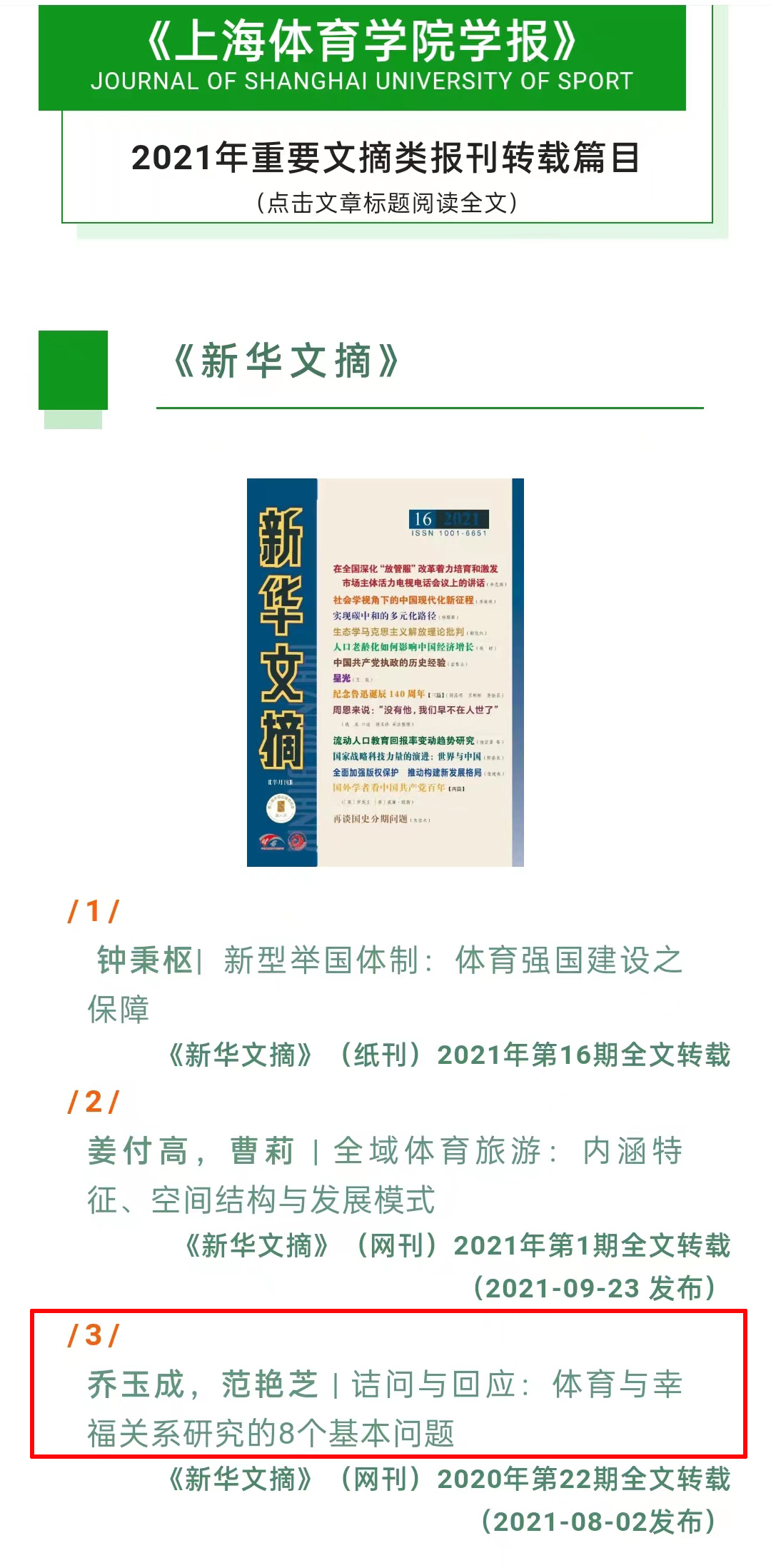 据悉,乔玉成教授和研究生范艳芝共同发表在《上海德赢vwin体育官网学报》2020年第7期的论文“诘问与回应:体育与幸福关系研究的8个基本问题”被《新华文摘》(网刊)2020年第22期全文转载。