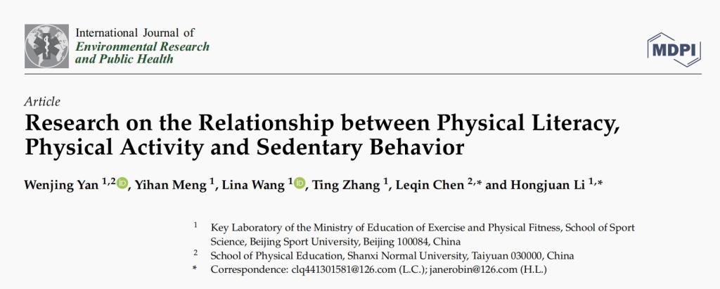 12月8日,德赢将青年教师在读博士闫文菁在《International Journal of Environmental Research and Public Health》学术期刊上发表的论文“Research on the Relationship between Physical Literacy, Physical Activity and Sedentary Behavior”(期刊为影响因子4.614),被JCR分区SSCI(Q1)收录。该论文研究发现轻体力活和久坐行为部分介导了身体素养和中高强度体力活动之间的关系;久坐行为和轻体力活动可以部分解释身体素养对中高强度体力活动的影响。在促进体力活动的措施中,不仅需要提高他们的身体素养,还需要管理久坐行为和提高轻体力活动。(院研究生部供稿)