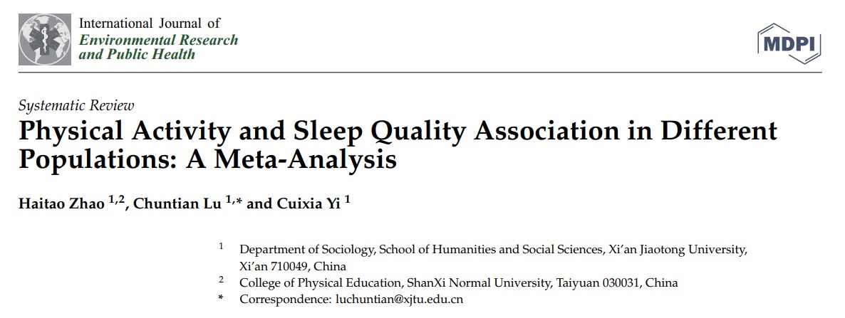1月20日,德赢教师在读博士赵海涛副教授在《International Journal of Environmental Research and Public Health》学术期刊上发表的论文“Physical Activity and Sleep Quality Association in Different Populations: A Meta-Analysis”(期刊影响因子4.614),被JCR分区SSCI(Q1)收录。该论文运用Meta分析研究方法发现不同人群身体活动与睡眠质量之间的关系;身体活动对睡眠质量的整体效应无明显的统计学意义,中低强度的身体活动对睡眠质量影响显著,而高强度的身体活动对睡眠质量的影响不显著。儿童与中老年通过身体活动可以改善睡眠质量。在身体活动干预实施过程中,通常可以采用太极拳、瑜伽、八段锦等干预内容。(院研究生部供稿)