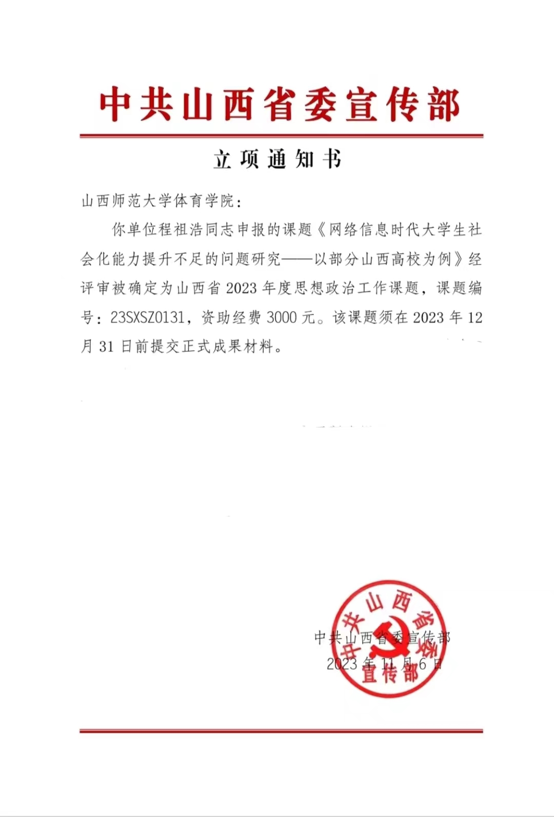 11月6日,山西省思想政治工作研究会2023年课题评审结果公布,由德赢团委书记程祖浩主持申报的《网络信息时代大学生社会化能力提升不足的问题研究——以部分山西高校为例》获得立项。学院高度重视大学生思想政治工作研究,积极组织德赢思政工作教师进行课题申报,通过科学研究进一步提升德赢思想政治工作科学化水平。(院办供稿)