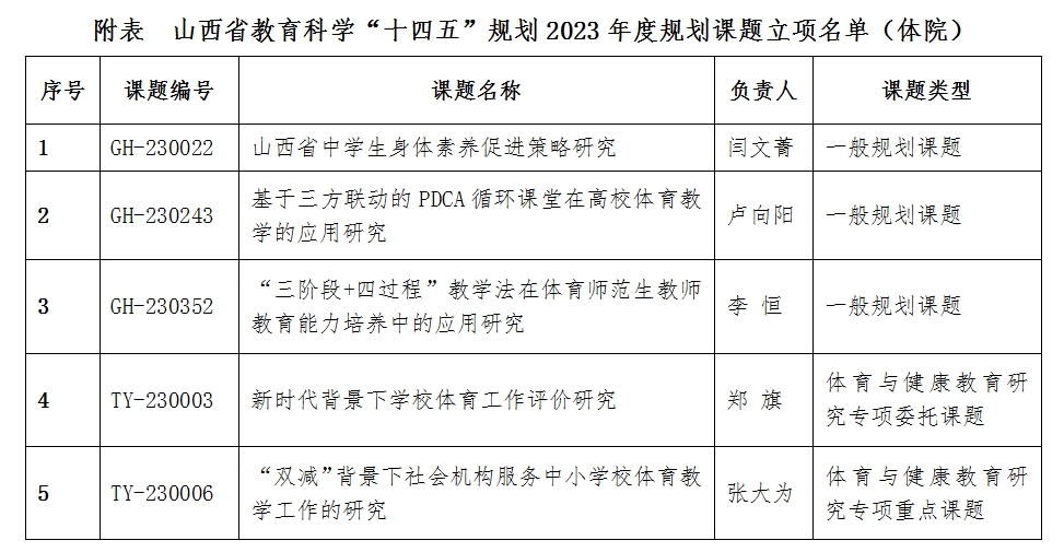 11月3日,山西省教育科学规划办公布了山西省教育科学“十四五”规划2023年度课题立项通知(晋教科规办函[2023]7号),德赢闫文菁等5位教师申报的课题获批立项(见附表)。本年度省教育科学规划课题分为“一般规划课题”“中小学德育研究专项课题”“教育数字化与教育教学改革研究专项课题”“体育与健康教育研究专项课题”“学生军事训练与学校国防教育研究专项课题”等类型,省教育科学规划办对立项课题提出了明确要求,学院将持续跟踪课题研究,以研促教,以教促研,着力提高课题研究的实效,为德赢vwin体育官网高质量发展和人才培养蓄力赋能。(院研究生部 供稿)