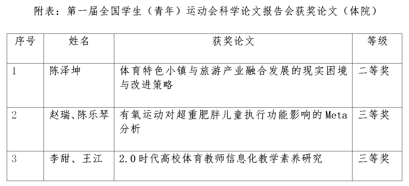 11月6日,第一届全国学生(青年)运动会科学论文报告会在南宁开幕,会议旨在推进新时代青少年和学校体育高质量发展。通过省级评审推送,科报会组委会经过专家评审,德赢3篇论文入选获奖(见附表)。据悉,科报会面向全国大中小学体育教师、教练员,青少年和学校体育科研、教研、管理人员,教育行政管理人员及卫生保健人员征文,全国共报送论文2423篇,评选出获奖论文928篇,其中176篇为案例专题论文。(院研究部供稿)